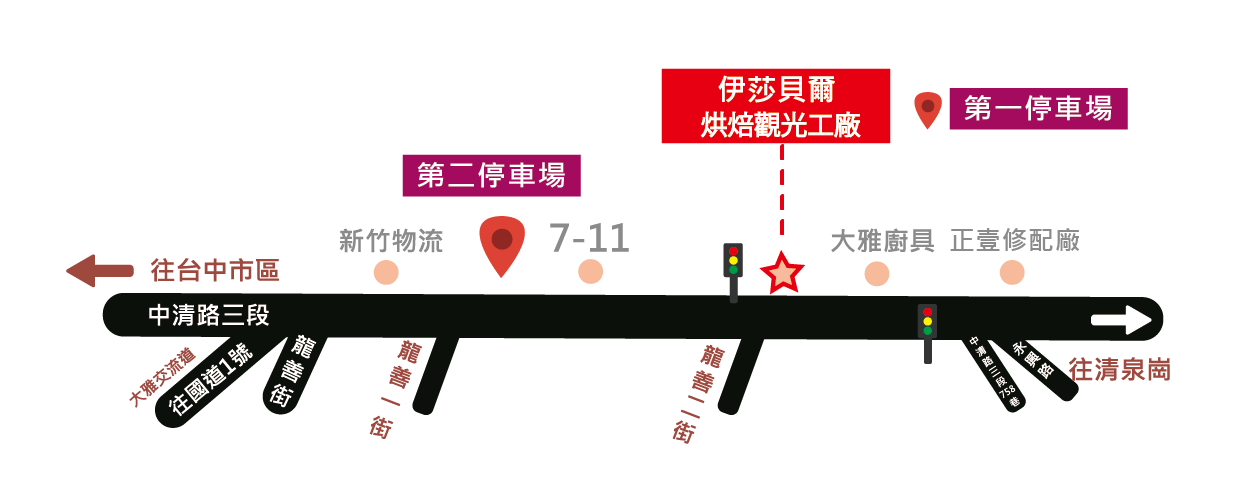 【北  上】 於台74線13k-中清路交流道下,沿環中路直行,於中清路三段左轉,往前直行,目的地在左側。
